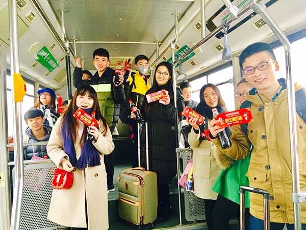 2017年1月13日“春運大潮”正式開始,第一波主流人群就是學生,除了搶車票,擠候車廳,還有前奏就是擠公交,搶出租車去車站。為了讓同學們更順利的回家,可口可樂在鄭州5所高校打造了愛心專列巴士,持續5天往返于車站和學校之間,助力按時抵達。“還有什么比回家更開心的嗎?還有什么比,邊喝可口可樂邊看別人擠公交車更開心的嗎?愛心巴士好贊,讓我們的歸家路無比快樂和暖心!” 河南輕工業大學大三耿嘉尉同學高興的說著。