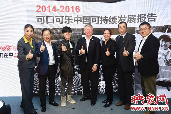 可口可樂(lè)中國(guó)攜手合作伙伴發(fā)布2014-2016可持續(xù)發(fā)展報(bào)告(左起:可口可樂(lè)大中華及韓國(guó)區(qū)副總裁張華瑩、壹基金秘書長(zhǎng)李勁、創(chuàng)作型歌手王嘯坤、可口可樂(lè)大中華及韓國(guó)區(qū)總裁馮廣晟、世界自然基金會(huì)全球淡水項(xiàng)目高級(jí)官員Judy Takas、世界自然基金會(huì)中國(guó)淡水項(xiàng)目總監(jiān)任文偉博士、可口可樂(lè)大中華及韓國(guó)區(qū)副總裁張建弢)