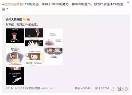 這條漫畫以陳安妮自己為主角,講述的是她在別人認(rèn)為只有1%成功可能的情況下,堅(jiān)持畫畫、創(chuàng)業(yè)、做APP的故事。漫畫推出隨即大熱,“姚晨轉(zhuǎn)了,趙麗穎也轉(zhuǎn)了”,在短時(shí)間內(nèi)就達(dá)到了45萬轉(zhuǎn)發(fā),閱讀人數(shù)超過2億。