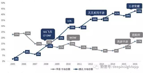 基于公司的財報和艾瑞的數據,我們做出了兩家公司在游戲市場份額的變化趨勢,2008年是一個明顯的轉折點,這一年騰訊開始超越網易,2008-2010年三年的時間,騰訊通過LOL、DNF、QQ飛車、CF等爆款把游戲市場份額從6%提高到了接近30%。