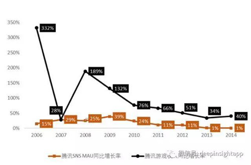 可以看到,騰訊SNS的MAU一直保持著一個較為穩定的增長率,而游戲收入增長率的波動相對較大,兩組數據并沒有出現很強的正相關。