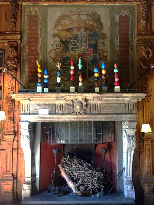 英國室內設計師 Ashley Hicks 手工制作的桌面圖騰裝飾被擺設在巨大的壁爐上。