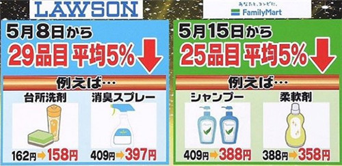 羅森和全家也迅速做出了反應(yīng)。5月8日起,羅森調(diào)整了店內(nèi)29款日用品的售價;5月15日起,全家的洗滌劑、洗發(fā)水等25款日用品也降價了。這三家便利店的降價幅度普遍達到了5%。緊接著,規(guī)模小一些的便利店Mini Stop也宣布要降價。
