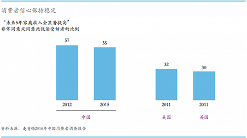 2015年調查數據顯示,55%的家庭認為未來五年家庭收入將會顯著提高,而英國和美國在2011年時的數據僅為32%和30%。
