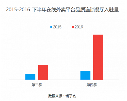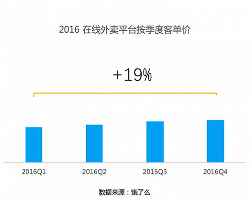 2016年,在線外賣平臺餓了么季度客單價提升19%,與此同時品質連鎖餐廳入駐外賣平臺數量大幅提升,同時營業額相比普通餐廳也較高。