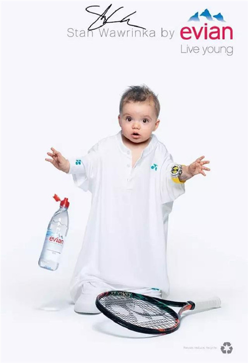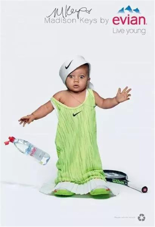 針對戶外、數字和社交網絡的創意則主要集中在一個 Evian Young Team 的概念,一個由依云代言人莎拉波娃、Stan Wawrinka、Lucas Pouille、Madison Keys 以及高爾夫球員 Lydia Ko 等人組成的團隊來拍攝廣告的主要視覺:喝了依云水之后,他們都換上一套 Oversize 的運動服,“變成了嬰兒”。