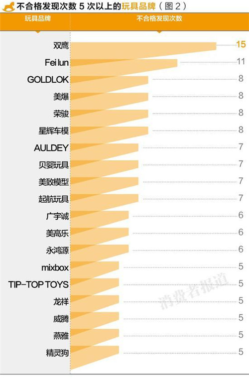 雙鷹與飛輪的不合格次數超過10次,而美高樂、星輝車模等較知名品牌也數次登上黑榜。兒童玩具的抽檢不合格項目主要集中在標志與危險警示不規范、以及小零件、尖端傷害等方面。