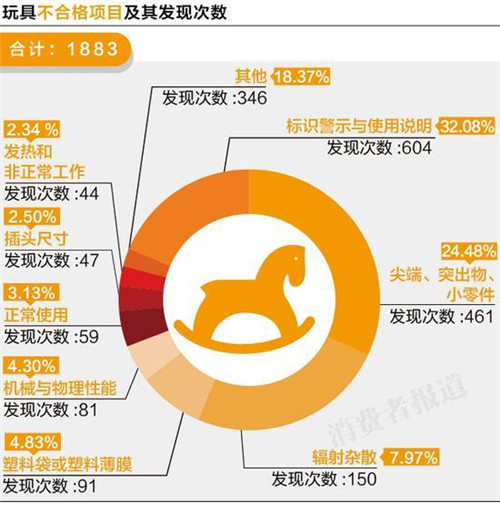 兒童產品的整體不合格發現率高達16.6%,美高樂、多喜愛、松堡王國、回力、步步高、青蛙王子、天堂傘等知名品牌均數次登上黑榜,兒童產品在標識、危險尖端與零件上存在更多的問題。