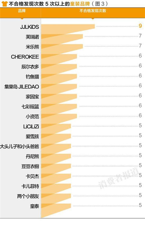 數據分析顯示,由郭濤父子代言的有30年創立歷史的季季樂(JJLKIDS)童裝的不合格發現次數竟高達9次。而兒童與嬰幼兒服飾的不合格項目集中在標識、纖維含量、pH值、使用說明等方面。