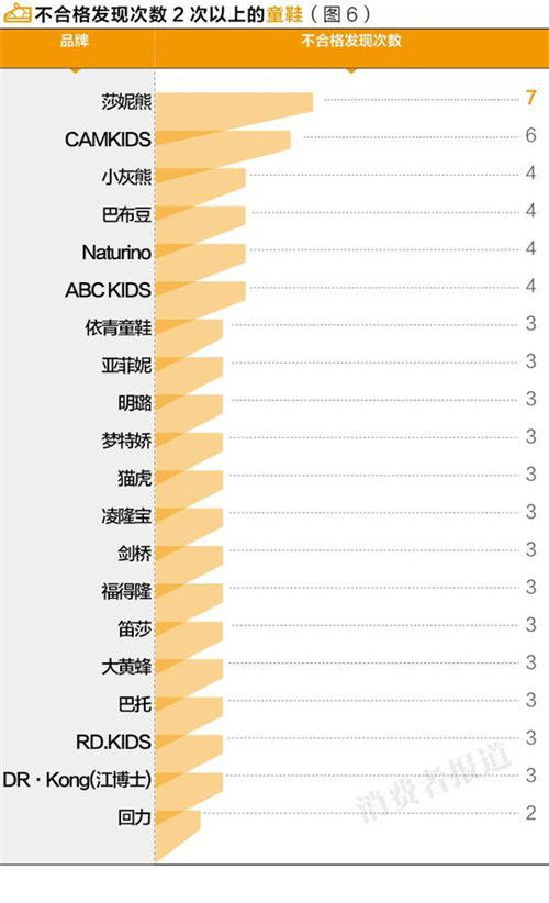 抽檢數據顯示,上海童鞋品牌莎妮熊的的不合格次數最高,而童鞋抽檢不合格的,回力也有兩次出現不合格。主要問題集中在強度硬度、標識、感官質量、高度(長度)誤差等方面。