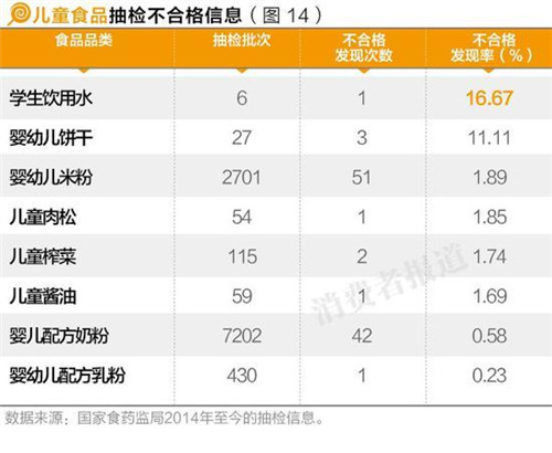 《消費者報道》通過梳理國家食藥監局2014年以來的12551條兒童食品抽檢數據發現,兒童食品的合格率較高,達99%,而不合格品牌也是較為小眾品牌。本刊提醒消費者謹慎購買奶粉不合格次數較多的幾個品牌,如雅因樂、冠爾優等。