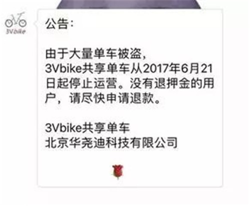 6月21日,共享單車(chē)平臺(tái)3Vbike對(duì)外宣布稱(chēng),由于單車(chē)大量被盜,即日起停止運(yùn)營(yíng)。并提醒沒(méi)有退押金的用戶盡快申請(qǐng)退款。