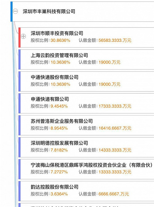 記者在企業工商信息查詢得知,目前豐巢科技最新的股權結構為,深圳市順豐投資有限公司為大股東,持股30.8636%,韻達系(上海云韻投資+韻達控股)為第二股東,持股共14%,中通持股10.3636%,申通持股9.4545%。