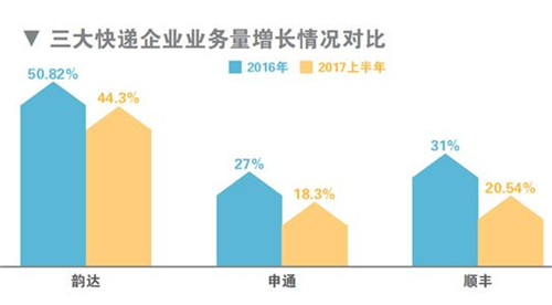 根據順豐發布的財報顯示,2017年上半年,順豐控股實現快件業務量13.73億件,同比增長20.54%;2016年順豐快件業務量為25.8億件,同比增長31%。而申通快遞2017年半年業務量為17.26億件,同比增長18.3%;2016年業務量近32.6億件,同比增長約27%。此外,韻達2017年上半年財報數據也顯示,業務量同比增長44.28%;相比2016年公司業務量50.82%的增幅有所減緩。