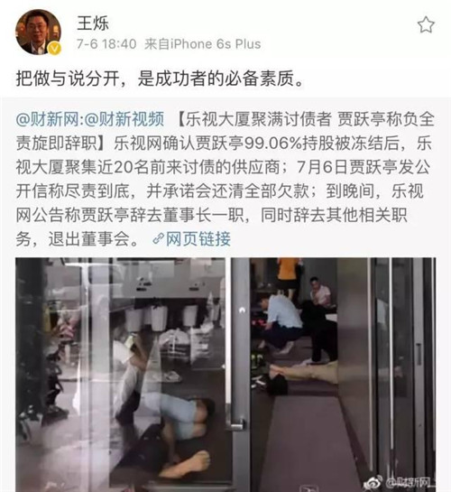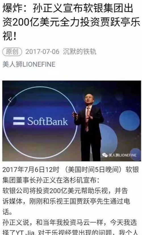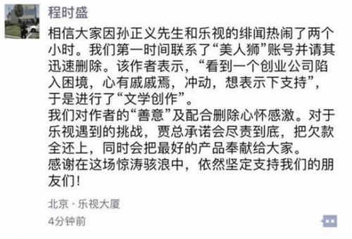 程時盛在朋友圈中寫到:相信大家因孫正義先生和樂視的緋聞熱鬧了兩個小時。我們第一時間聯系了“美人獅”賬號并請其迅速刪除。該作者表示,“看到一個創業公司陷入困境,心有戚戚焉,沖動,想表示下支持”,于是進行了“文學創作”。我們對作者的“善意”及配合刪除心懷感激。對于樂視遇到的挑戰,賈總承諾會盡責到底,把欠款全還上,同時會把最好的產品奉獻給大家。感謝在這場驚濤駭浪中,依然堅定支持我們的朋友們!