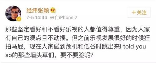 那些堅定看好和不看好樂視的人都值得尊重,因為人家有自己的觀點且不動搖。但之前樂視發展很好的時候狂拍馬屁,現在人家碰到危機和低谷時跳出來I told you so的那些墻頭草們,要不要臉呢?