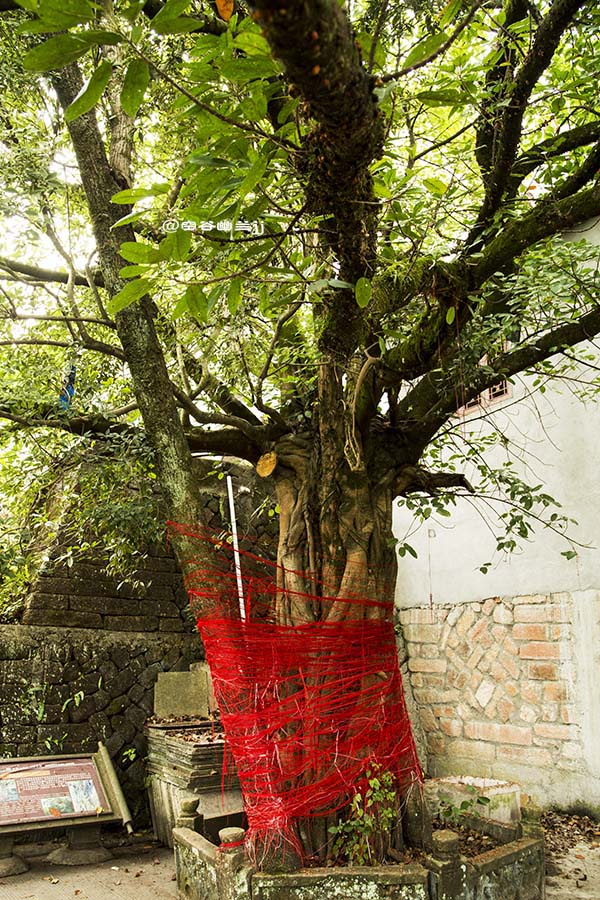 鴛鴦樹生長在六祖堂舊址旁邊。遠看,它婷婷玉立如一體,枝葉婆娑不分彼此;近看,則可辨清樹干一里一外,兩種不同科目的樹相互依存。一株四百多歲的百日青,一株一百多歲的筆管榕,它們的樹葉交錯,各現姿容,好象久別重逢的情侶,互相擁抱著站立在幽靜的山谷間。
