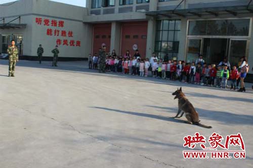 在老師和消防隊員的帶領下,孩子們有秩序地參觀。首先參觀了一樓車庫,孩子們被消防車以及車上的先進裝備深深吸引,消防員叔叔耐心細致地為孩子們講解消防車上的小秘密:高壓水槍、防毒面罩、氧氣瓶、急救箱、云梯、泡沫噴射槍、定位器、呼救器等消防裝備,使孩子們開了眼界。消防隊員還用淺顯的語言向孩子們介紹了消防常識:火災的危害、火災的預防、火災發生時的逃生自救、消防器械的使用、消防服的穿戴等等。接著孩子們參觀了二樓的消防員宿舍、圖書室、會議室、體育活動室等,更深入地了解了消防員的學習生活,更加走近消防員。最后,消防員為孩子們帶來了精彩的警犬搜救表演,孩子們興高采烈,不約而同為消防員叔叔鼓掌叫好!