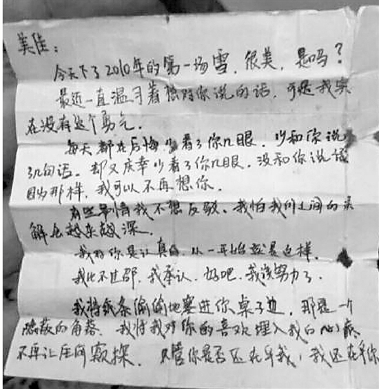 昨天網(wǎng)友“來呀來呀快來打我呀”發(fā)了一條微博,說的是他的學妹于無意間在教室桌子的縫隙里,發(fā)現(xiàn)了一封情書——情書是一個男生在2010年寫給一個叫“美佳”的人。