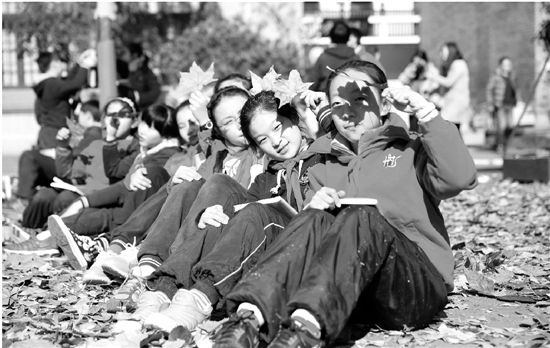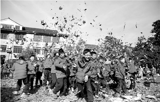 中午,當錢報記者趕到學校時,被眼前的景象驚到了:150米的環形操場中間,鋪滿了金黃色的落葉,一群學生正把落葉滿滿地捧起,再高高地往上一拋,于是只見滿眼的落葉紛飛……
