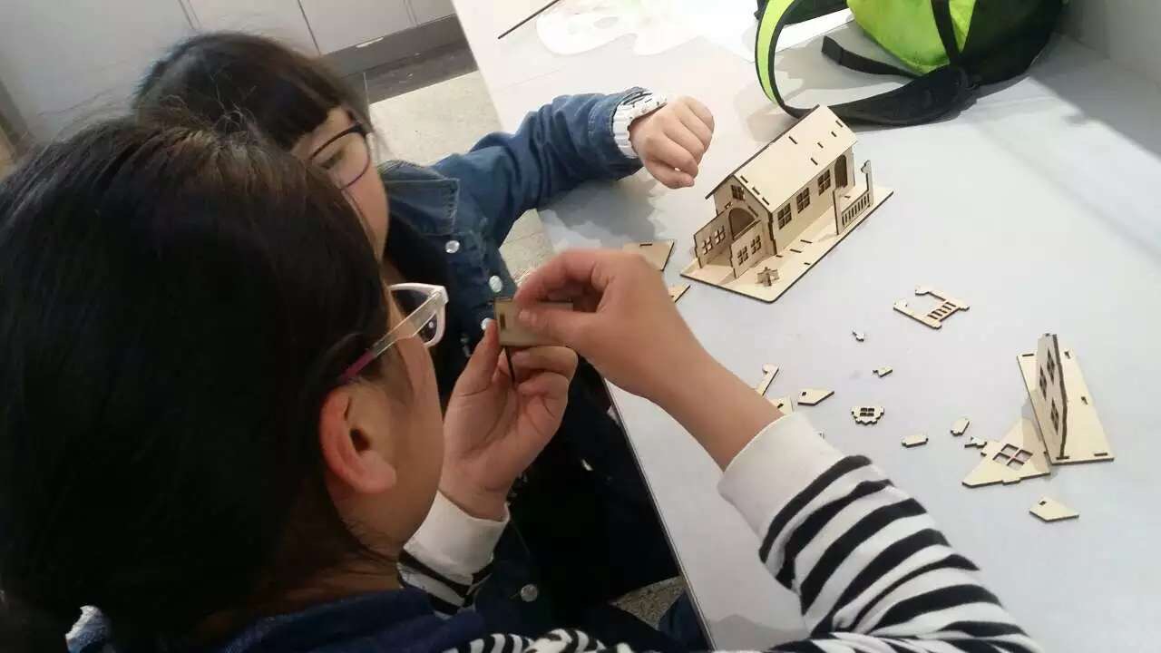 在激光加工區,用激光機切割而成的大小不一、形狀各異的零件引起了同學們的興趣。同學們齊心協力,將一個個零件拼裝成了房屋模型??粗粭潡潉e墅呈現在眼前,孩子們歡呼雀躍,體驗著動手動腦的樂趣,感受著成功的喜悅。
