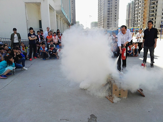 安全疏散演練完畢后,學校安全員為孩子們講解了校園防火、使用滅火器知識,以及火場逃生自救方法等消防安全常識,并現場指導師生干粉滅火器的使用方法。各班選出學生代表以及部分教師用滅火器進行了現場滅火,參與活動的師生嚴格認真地按照滅火方法進行著操作,燃燒的“火魔”瞬間被“消防員”撲滅,場上觀看的師生報以熱烈的掌聲。