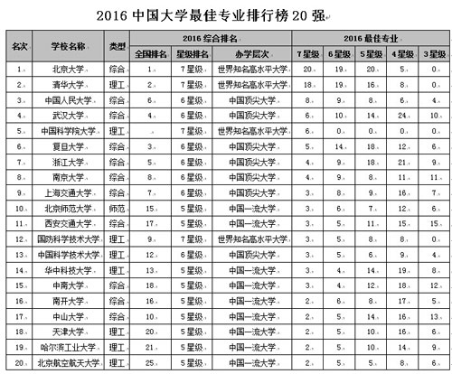 報告顯示,北京大學20個專業榮膺中國七星級專業,居2016中國大學最佳專業排行榜榜首;清華大學第2,中國人民大學第3,武漢大學第4,中國科學院大學第5。