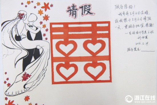 9月19日,在浙江理工大學藝術與設計學院,老師顧紅建正在展示學生們交上來的請假條。這些請假條風格多變,充滿創意,有簡筆畫風格的,也有抽象的。比如有學生畫了一班開走的列車和一個追趕的小人兒,表示趕不上末班車而遲到;有的把假條做成了賀卡,折頁打開一個大紅喜字,畫上浪漫的婚禮現場,用中英文寫上請假“文案”,原來是參加姐姐的婚禮。顧老師說,讓學生制作手繪假條,希望學生們學會在生活中用藝術語言敘事,同時也想幫學生們留下大學生活的回憶。(浙江在線記者 楊曉軒 李翔 于詩奇 攝)
