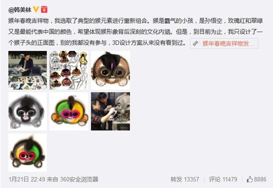 春晚吉祥物康康由“福娃”的創(chuàng)作者之一韓美林設(shè)計(jì),官方稱是以中國(guó)傳統(tǒng)水墨畫的藝術(shù)形式,生動(dòng)表現(xiàn)出“猴”的機(jī)靈活潑特點(diǎn)。看看韓老師的手稿,也是能get到喜慶的氛圍和毛茸茸的手感,還算是只討人喜愛(ài)的猴子↓