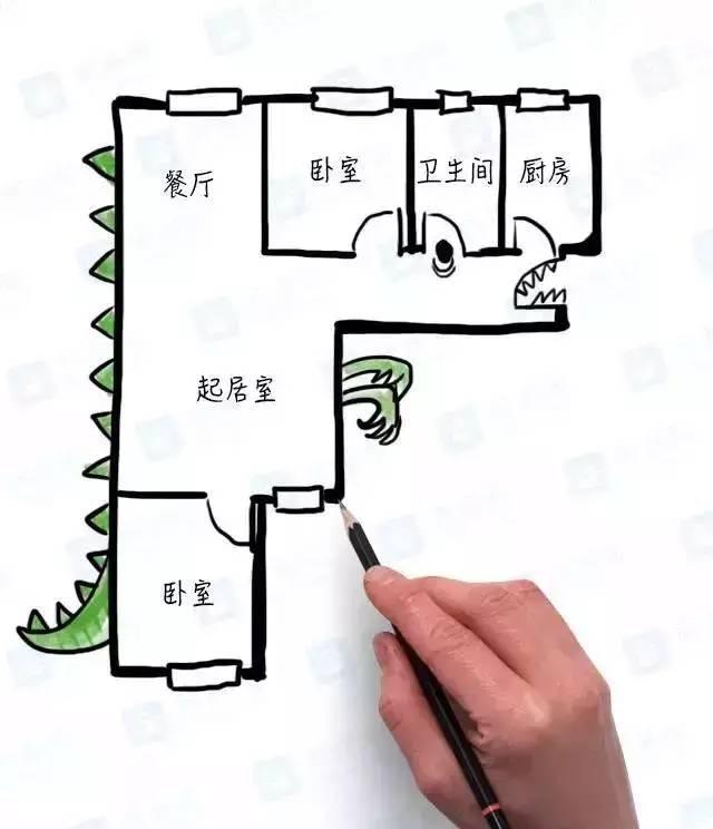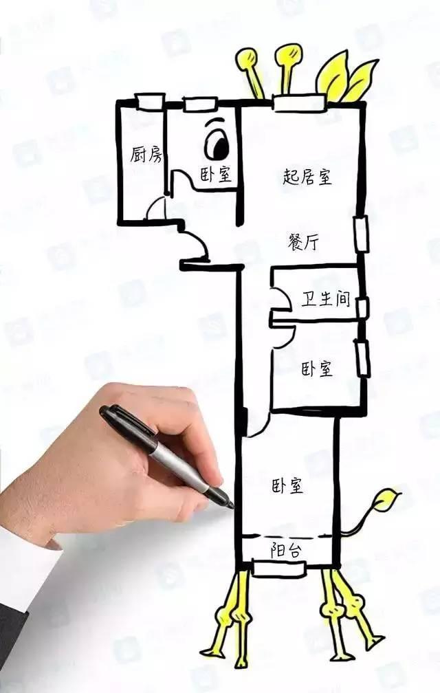 2、這是一個(gè)狹長(zhǎng)的空間,客廳完全沒有采光和通風(fēng),整個(gè)屋子都亮不起來(lái),兩件臥室橫框整個(gè)房子,如果做兒童房還真不太方便。