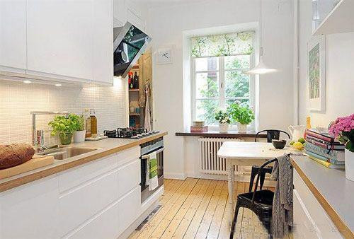 一般家庭的廚房多采用白色或淺色裝潢以及不銹鋼水槽的設置,色彩豐富的植物可以柔化硬朗的線條,為廚房注入一股生氣。通常廚房位于窗戶較少的朝北房間,由于陽光少,應選擇喜陰的植物,如廣東萬年青和星點木之類。而且廚房是操作頻繁、物品零碎的工作間,煙和溫度都較大,因此不宜放大型盆栽,而吊掛盆栽則較為合適。