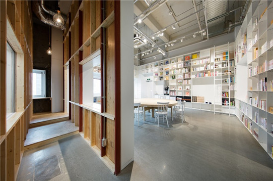 這個建筑工作室通過創建一個既包括圖書館,另外還有一個蛋糕店的空間來完成人們輕松聚集在一起這個愿望。看似毫不相關的兩個空間,只要提供了一個聚集區,就形成了一個互動,兩者就聯系在了一起。