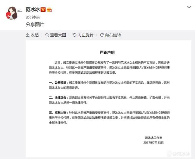 7月13日,范冰冰工作室針對郭文貴此前發(fā)布的與范冰冰有關(guān)的言論,做出“嚴正聲明”,并宣布將在美國啟動訴訟程序起訴郭文貴。