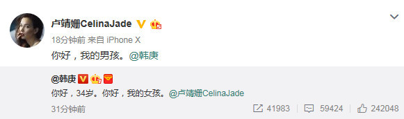 2月9日,韓庚在34歲生日當天于微博公布與《戰狼2》女主角盧靖姍的戀情:“韓庚你好,34歲。你好,我的女孩。@盧靖姍CelinaJade ”。盧靖姍則回道:“你好,我的男孩。@韓庚。”