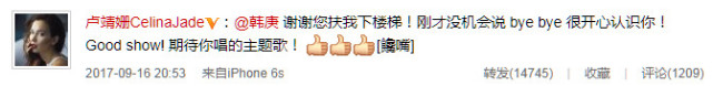 去年9月16日,第31屆金雞獎舉行頒獎典禮,盧靖姍曾與韓庚搭檔頒發最佳音樂獎,同臺互動。下樓梯時,韓庚細心地扶著盧靖姍,非常紳士。事后,盧靖姍還發微博專門感謝韓庚。