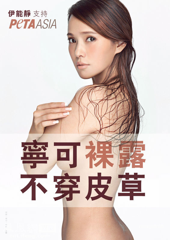 2012年3月8日,香港,44歲的伊能靜原本是皮草愛好者,曾收藏超過50件皮草,不過她為了反皮草,加入善待動物組織知名的“寧可裸露,不穿皮草”活動。她上半身全裸入鏡拍攝反皮草廣告時,一絲不掛只用雙臂抱著34D秀胸入鏡,其中一張側(cè)面的照片,還露出股溝。