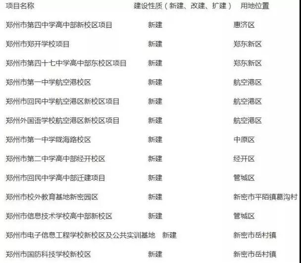 表格中顯示的學校鄭州一中、鄭州外國語學校等知名中學的新校區,家里有孩子該上學的朋友趕緊看看你家附近有沒有學校要新建!