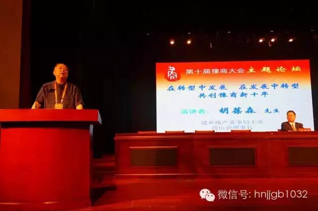 建業集團董事局主席、嵩山會理事長胡葆森先生 發表了“在轉型中發展 在發展中轉型 共創豫商新十年”的演講,對“為什么要轉型,如何轉型”做出精彩見解。“轉型不是轉行,而是圍繞既有的資源進行轉型。要充分利用互聯網思維,在相關的產業鏈上進行轉型”。