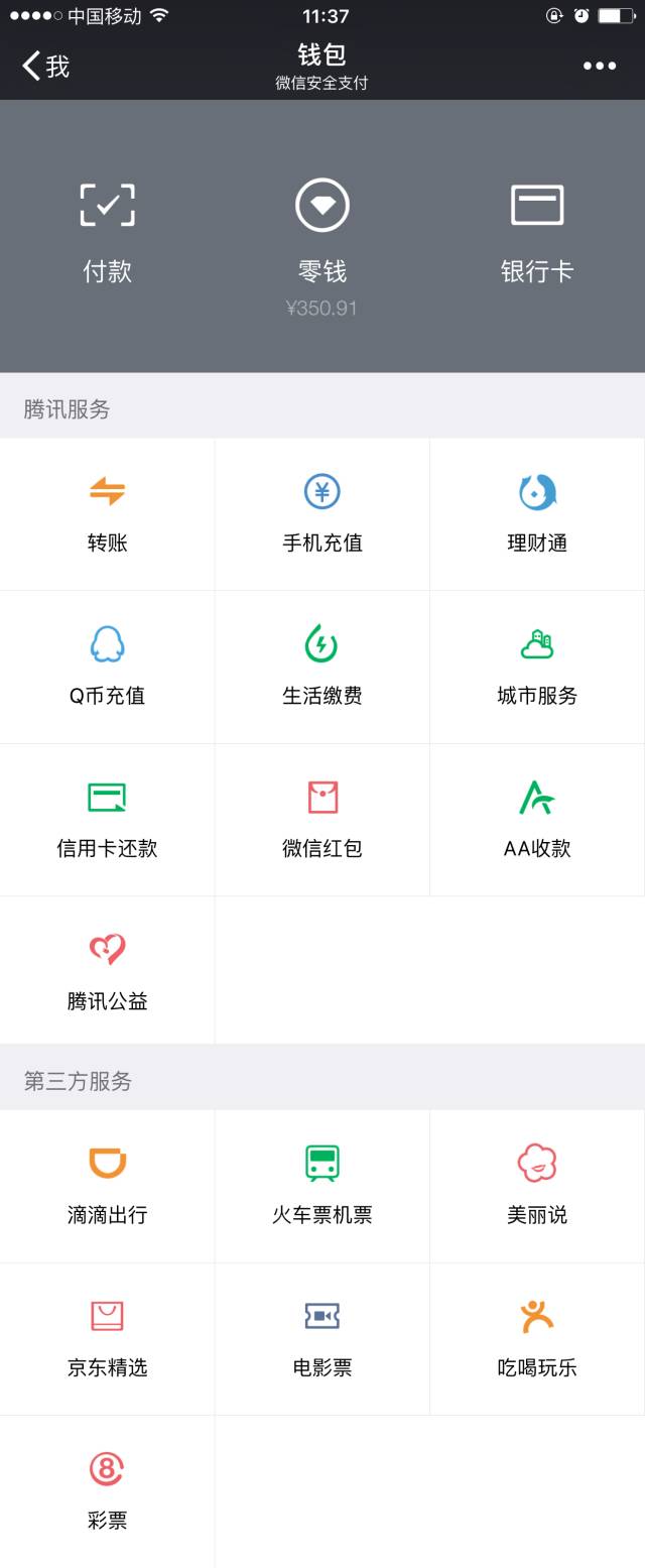 可用地盤:京東、滴滴出行、大眾點評、美團、餓了么、攜程等……更多用法早已經藏在微信“錢包”里了