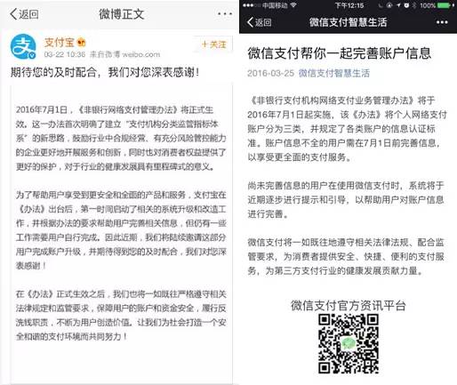 22日,支付寶官方微博發(fā)表聲明稱,“支付寶將在《辦法》出臺(tái)后正式啟動(dòng)相關(guān)系統(tǒng)升級(jí)與改造工作,并且?guī)椭脩暨M(jìn)行相關(guān)操作。”25日中午,微信支付在其官方賬號(hào)“微信支付智慧生活”發(fā)布了題為《微信支付幫你一起完善賬戶信息》的短文。