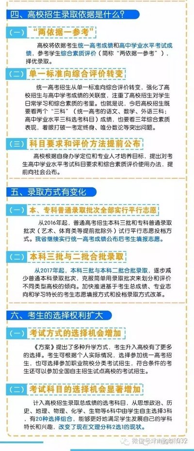 按照《方案》要求,我省從2018年秋季入學(xué)的普通高中一年級(jí)學(xué)生開始啟動(dòng)高考綜合改革,考生總成績由統(tǒng)一高考的語、數(shù)、外3科成績和高中學(xué)業(yè)水平3個(gè)選考科目成績組成。招生錄取實(shí)行基于統(tǒng)一高考成績和高中學(xué)業(yè)水平考試成績、參考學(xué)生綜合素質(zhì)評(píng)價(jià)擇優(yōu)錄取機(jī)制。