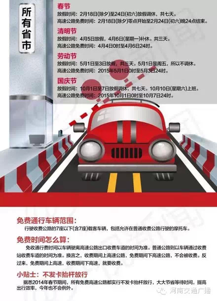 2015年春節放假安排時間表已經出爐,春節高速公路免費時間具體從哪天開始?持續多長時間?哪些車型可以免費通行?