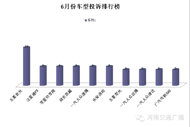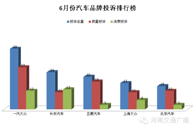 2015年6月份,河南交通廣播《1041維權直通車》接到汽車投訴418起,本次投訴排行榜上海大眾首次退出了“前三甲”,但一汽大眾仍然一馬當先。