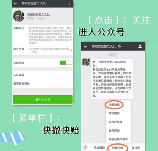 支隊科研所此次研發的交通事故快賠快撤功能,跳出了以往單方損失2000元以下的限制,只要在交警二大隊轄區:嵩山路(含)嵩山路以西區域及中原區、西開發區全境,公共道路上發生的兩車事故,車輛能夠正常駕駛,沒有人員受傷,就可以通過“鄭州交巡警二大隊微信公共平臺”進行快撤快賠處理。