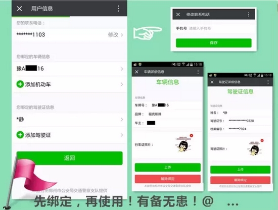 分別填寫:聯系電話、綁定車輛信息、綁定駕駛證信息確認無誤后按確定保存。