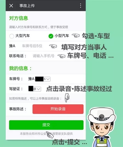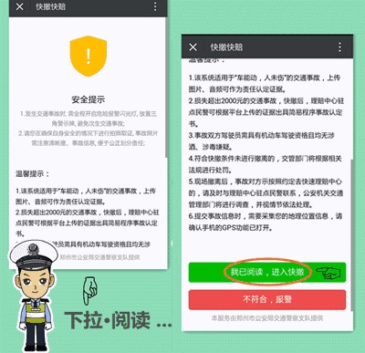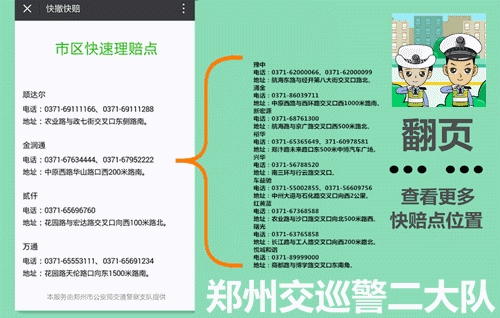 4、適用范圍:交警二大隊轄區內嵩山路(含)嵩山路以西區域及中原區、西開發區全境,公共道路上發生的兩車事故,車輛能夠正常駕駛,沒有人員受傷,均適用。