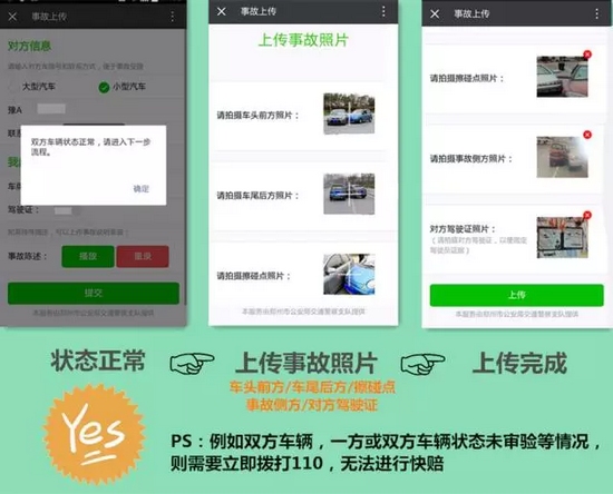 該功能上線后,親們,再也不用站路邊“說個舌尖帶火,嗓子冒煙”了,只需拍幾張現場,照片發個微信就可以馬上閃人、撤離事故現場!既不造成交通擁堵又安全省力。