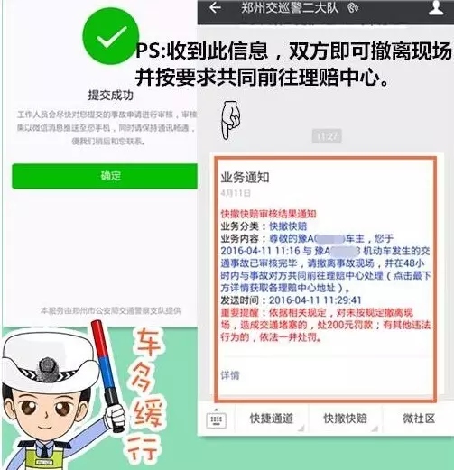 同時,小編將進行快速審核,將符合條件的申請審核通過。當您的微信收到“業務通知”,雙方即可撤離現場,并在48小時內共同相約前往就近的快速理賠中心。