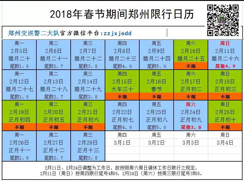 依據《國務院辦公廳關于2018年部分節假日安排的通知》(國辦發明電〔2017〕12號)(以下簡稱為《通知》)和《鄭州市人民政府關于實施機動車限行措施的通告》(鄭政通〔2017〕42號)(以下簡稱為《通告》),現將2018年春節假期前后的機動車限行規定通知如下: