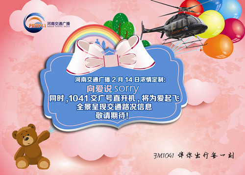 2月14日當天,1041交廣號直升機也將再次為愛起飛,在全景呈現路況信息的同時,為您提供情人節私人定制飛行。如果你足夠幸運,將有機會坐上1041交廣號直升機,和你的那個Ta獨享二人世界,遨游藍天、一起俯瞰鄭州美景。